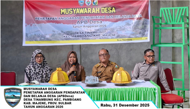 Desa Tinambung, Rabu 31 Desember 2025 – Pemerintah Desa Tinambung, Kecamatan Pamboang, Kabupaten Majene, Provinsi Sulawesi Barat, telah menetapkan Anggaran Pendapatan dan Belanja Desa (APBDesa) Tahun Anggaran 2026 melalui Musyawarah Desa yang dilaksanakan di Gedung Olah Raga Desa Tinambung.